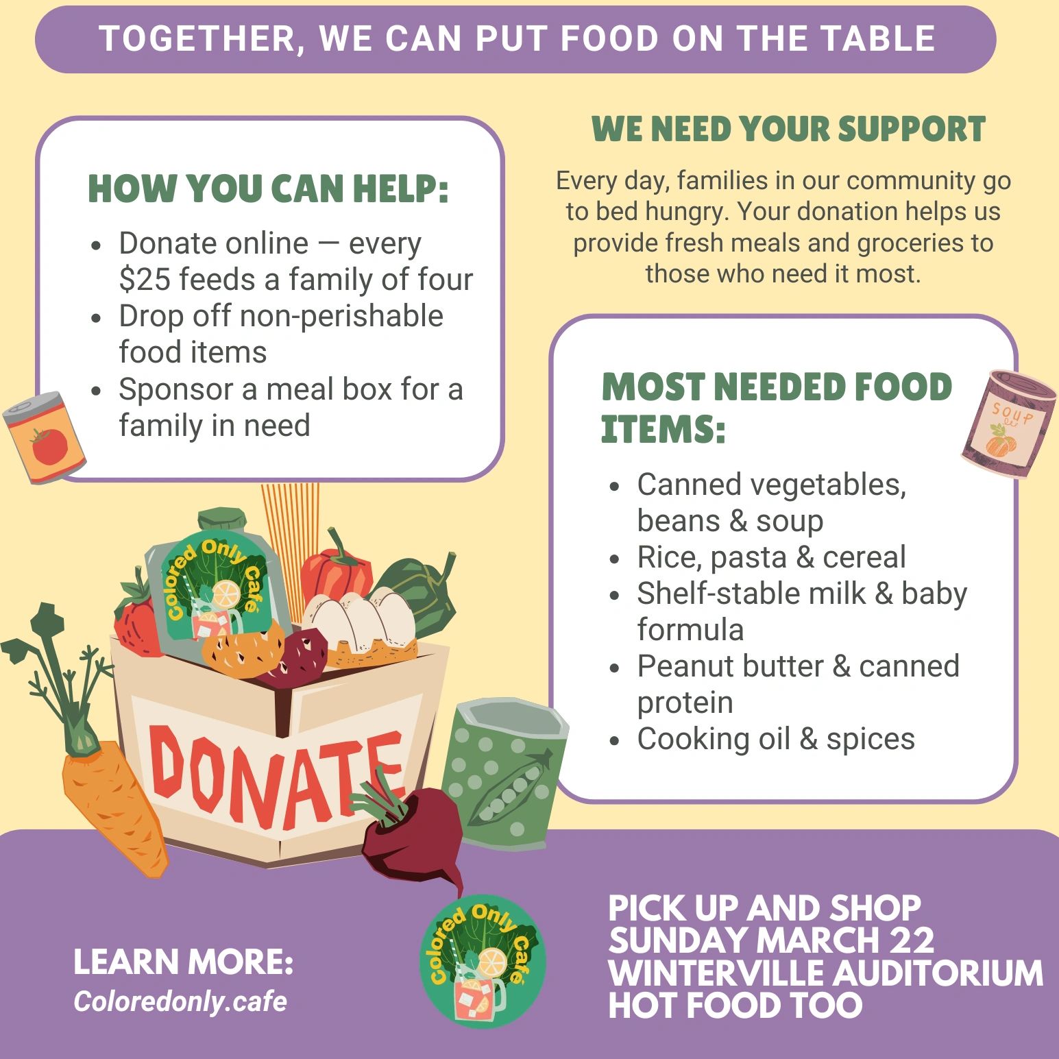 "AT COLORED ONLY CAFE WE CELEBRATE-COLORFUL FOODS, BRIGHT CONVERSATION, RICH CULTURE, AND BRILLIANTLY BLENDED COMMUNITIES